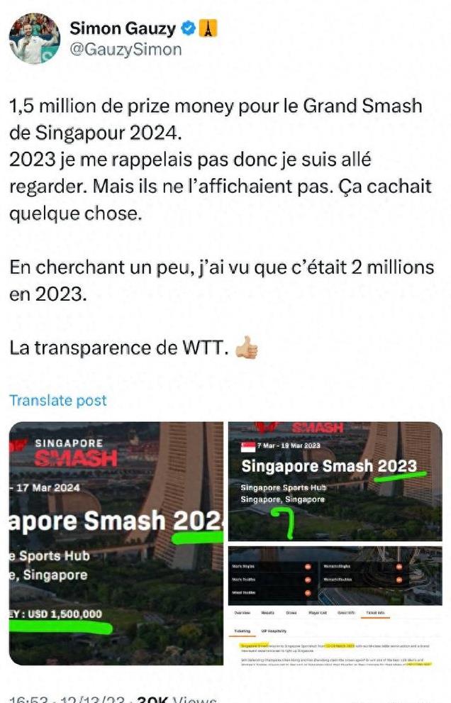 这次西蒙高茨提出的问题是,他对比了2024年和2023年这两年WTT新加坡大奖赛的奖金,2024年的总奖金是150万美元,后者并未在主页显示,经过查询发现,2023年新加坡大奖赛的总奖金是200万美元,也就是说,2024年相比2023年,总奖金数还少了50万美元,相等于减少了四分之一。
