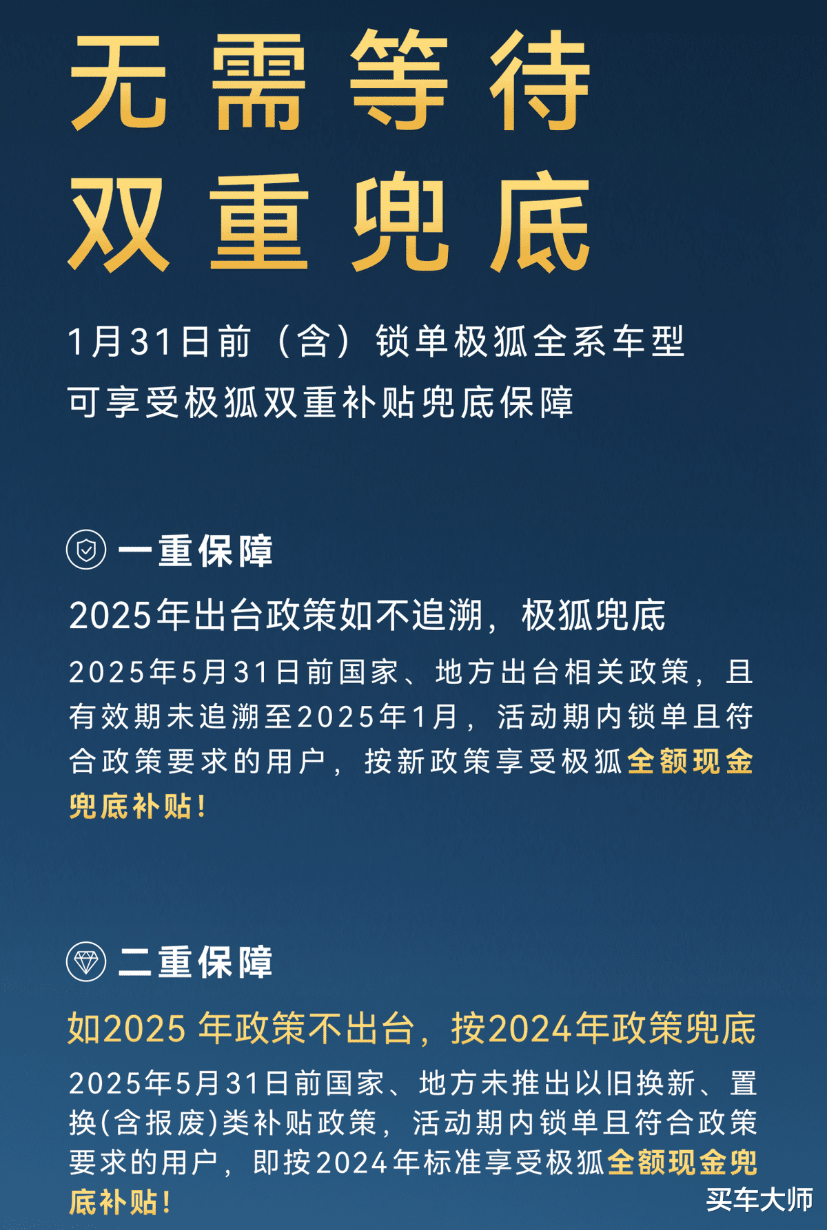 甚至极狐还站在用户角度未雨绸缪,为了让用户随时能以最优的价格购车,极狐还推出了“无需等待 双重兜底”政策,即2025年政府若出台新的政策,极狐为您全额现金兜底!如未出台政策,继续享受2024年政策,再度展现出为用户全方位护航的大厂风范。