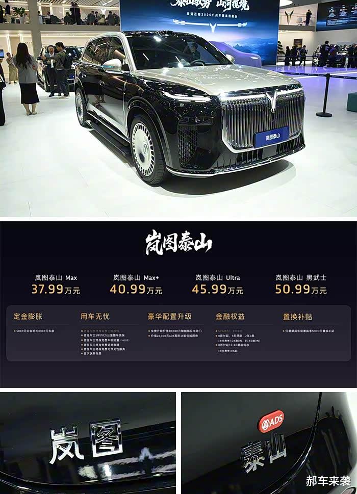 2025年11月,岚图旗下豪华大六座SUV—岚图泰山正式上市,新车共推出四款车型,售价区间为37.99万~50.99万元,甚至被网友戏称为“库里岚”,那么根据售价和定位,郝哥认为岚图泰山的主要竞争对手将锁定为问界M9和腾势N9等主流大型SUV。此外,岚图泰山限量版车型黑武士版本也将于明年第一季度发布。