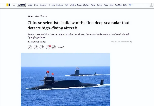 更具战略价值的是,该系统采用被动监听模式,无需主动发射信号,可在隐蔽状态下完成对空探测。港媒分析,配合潜射防空巡飞弹或跨介质无人机,解放军核潜艇将成为全球首个具备现代防空能力的潜艇型号,彻底扭转“潜艇怕飞机”的被动局面,甚至能主动设伏猎杀反潜机,构建起“水下反空防线”。