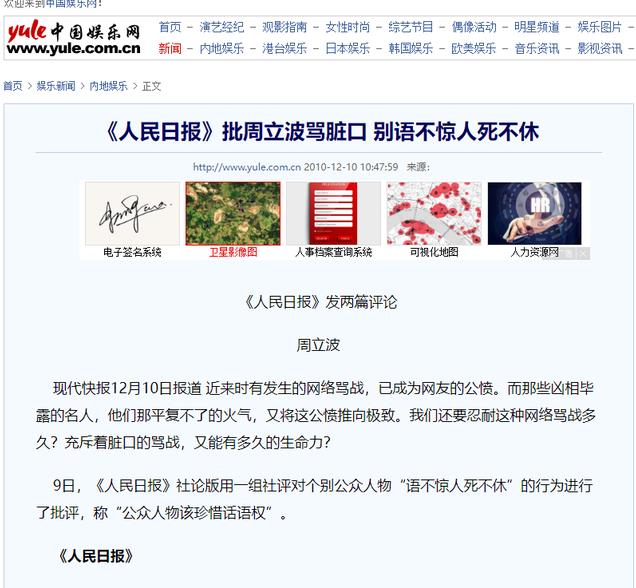 3.中国娱乐网 <人民日报>批周立波骂脏口 别语不惊人死不休》 2010-12-10
