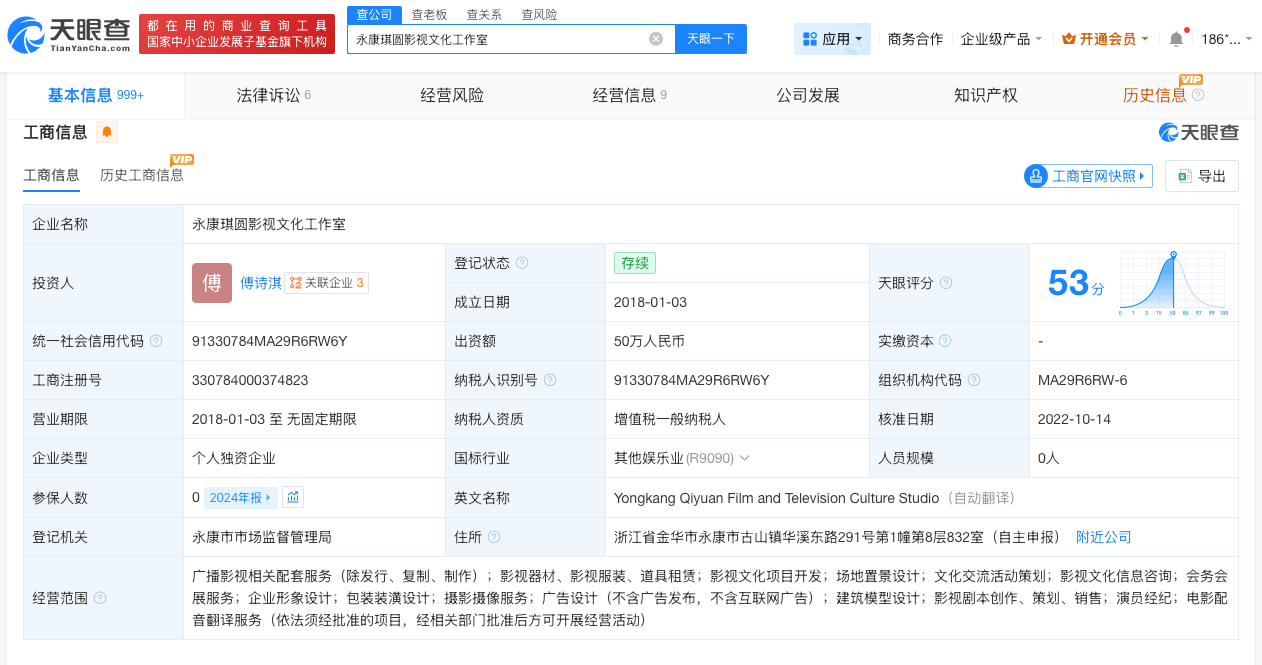 天眼查任职信息显示,傅诗淇(成毅)名下关联3家企业,其中永康琪圆影视文化工作室为其个人独资工作室。该工作室成立于2018年1月,出资额50万人民币,经营范围包括广播影视相关配套服务、影视文化项目开发等。