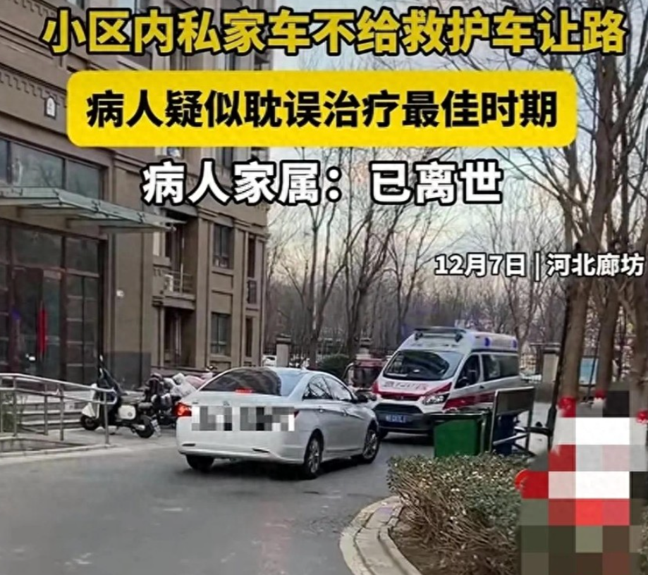 2024年12月6日清晨7点,河北廊坊大厂回族自治县的一个小区里,上演了一出令人心痛的人性悲剧。一辆白色私家车,硬生生把一辆执行紧急任务的救护车堵在路上,逼得救护车连连后退。这一幕被居民拍下,在小区业主群里迅速传开。