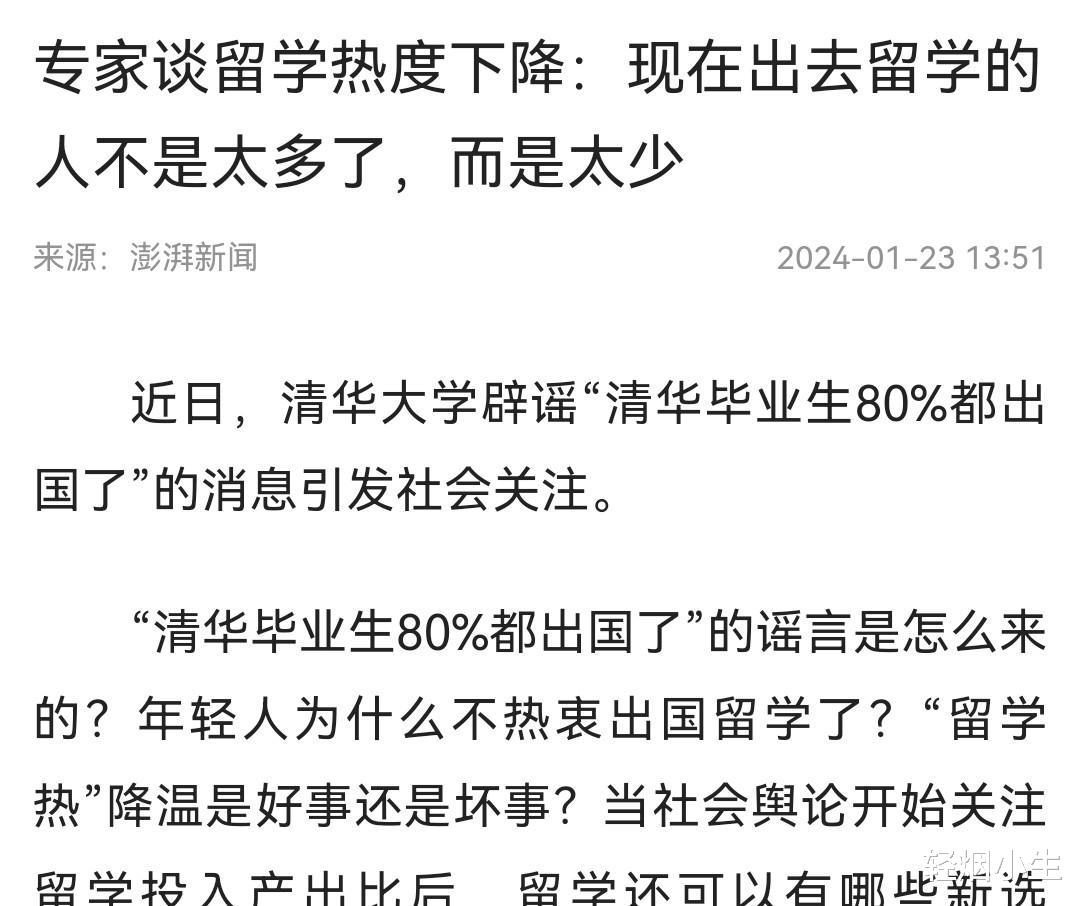 信息来源:澎湃新闻2024-1-23 专家谈留学热度下降:现在出去留学的人不是太多了,而是太少