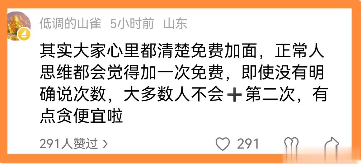 说是免费续面,却没有说几次,人家顾客续第2次却要收钱,作为顾客,我们能够理解,人家心里是很不痛快的。