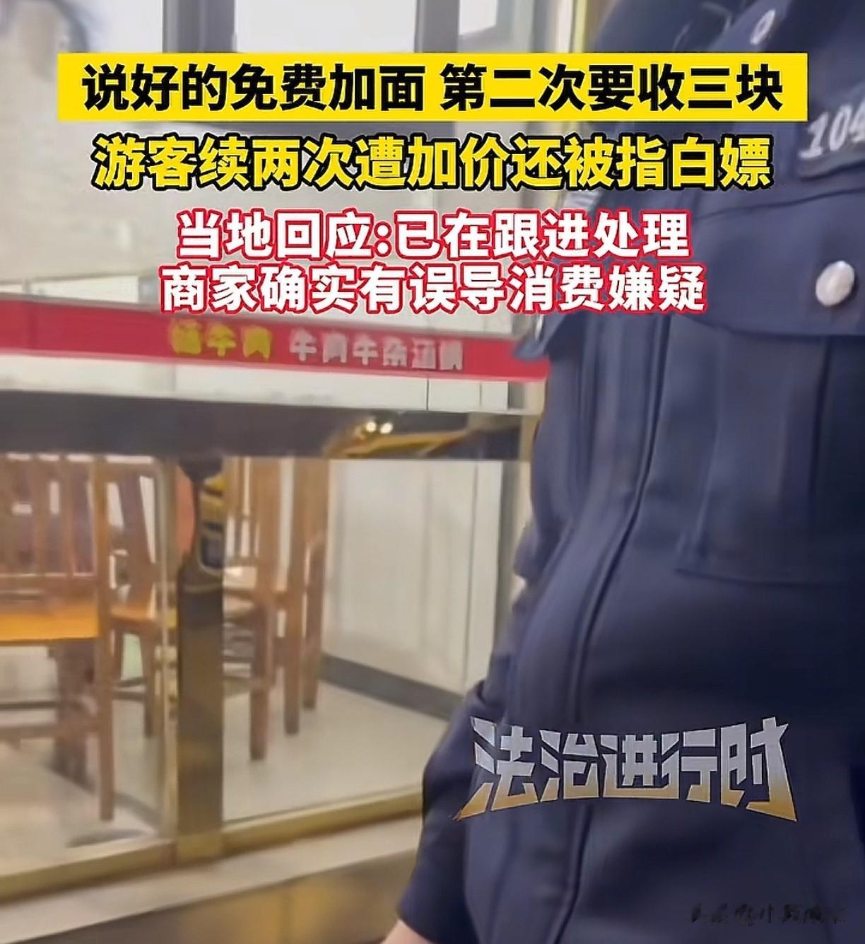 确实,因为3块钱续面闹成这样,也是太丢人了。不过,这事情其实并不复杂,店家在招牌上写的可以免费续面,这才是问题的根源。