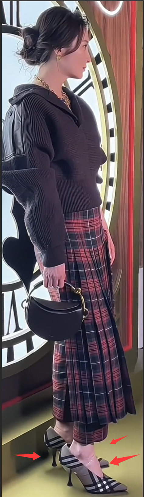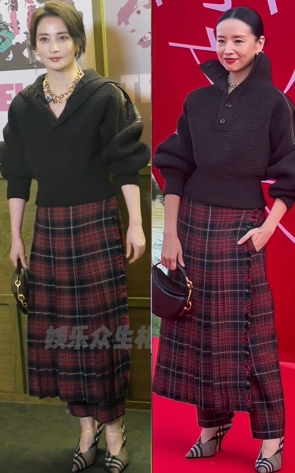 蒋勤勤比董洁身高更有优势,带门帘的格子裙到董洁脚背但只到她脚踝,看上去更慵懒风一点,只是高跟鞋不合脚,用透明的胶带固定大大影响了美观。