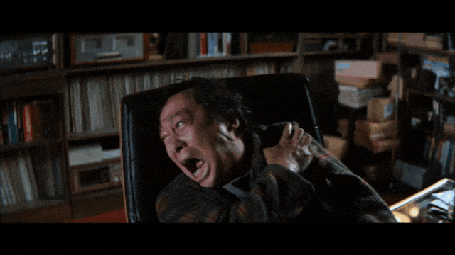 枪被胶带绑在手上,隔热手套笨拙又滑稽,音乐震耳欲聋,三个人在地板上翻滚扭打,误会层层叠加。