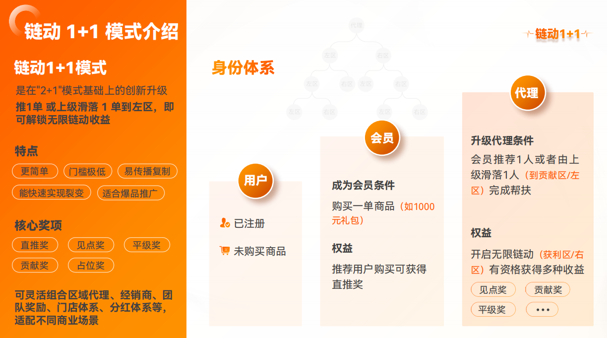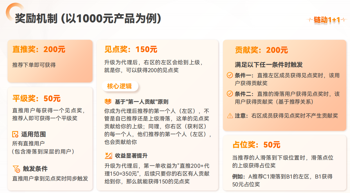 收益模型是激励的核心。“链动1+1”通过五大奖项,全方位点燃每一个环节: