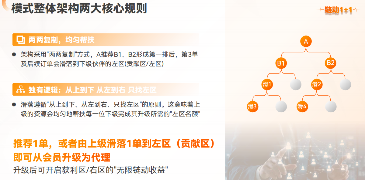 清晰路径:从“会员”晋升为拥有管道收入的“代理”,路径极其透明。只需成功推荐1单,或依靠系统的智能“滑落”机制获得1个左区名额,即可完成升级。目标明确,动力十足。