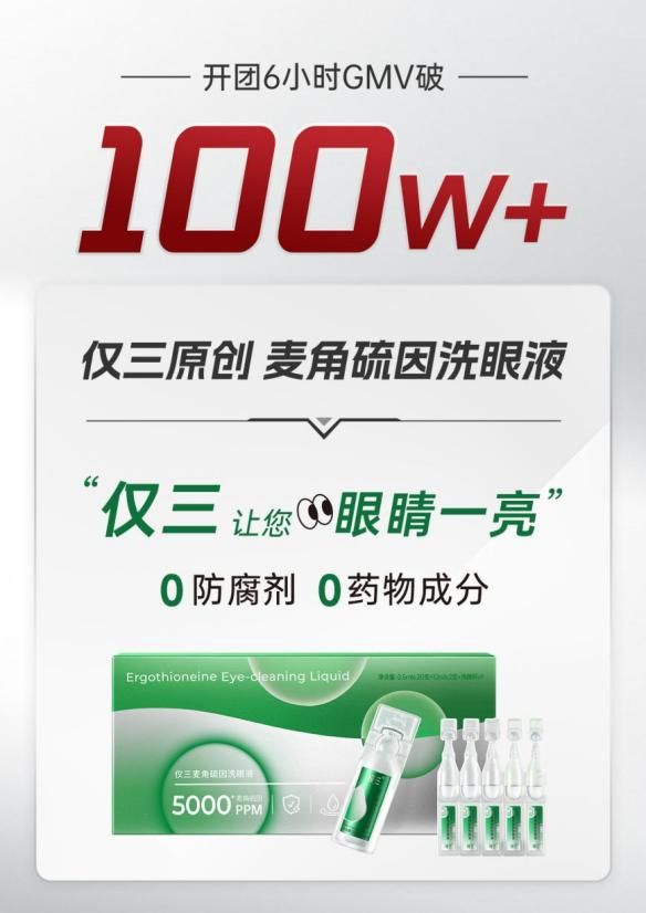 仅三原创的洗眼液足量添加了高达5000+PPM且纯度为99.99%的麦角硫因,229道尔顿的超小分子、强抗氧化能力,帮助清除眼部自由基,并且不含激素、防腐剂、药物成分,是受干眼症困扰、长期戴美瞳隐形眼镜、用眼过度人群的福音。目前,仅三麦角硫因洗眼液已通过SGS菌落检测、眼刺激测试等一系列第三方机构认证,在改善眼疲劳、红血丝、眼干涩方面,均取得良好的市场反馈。
