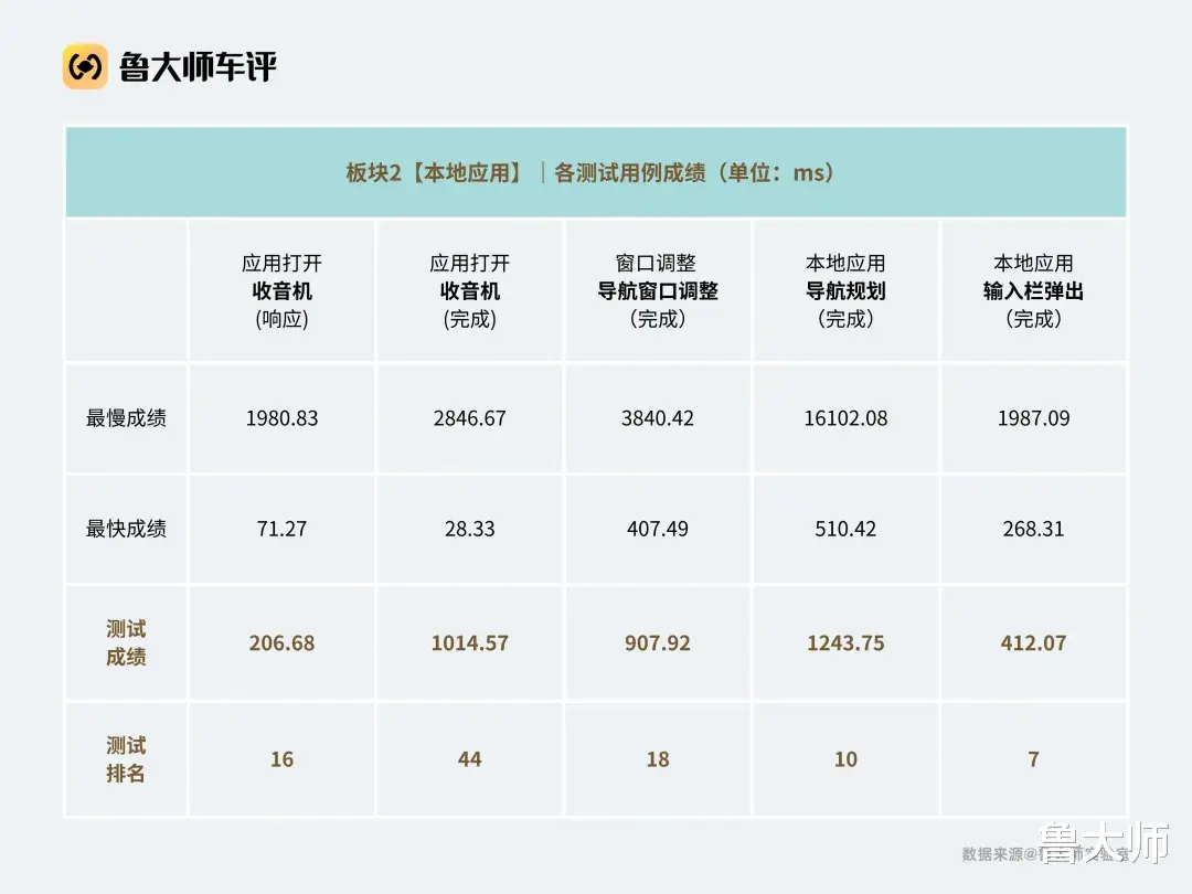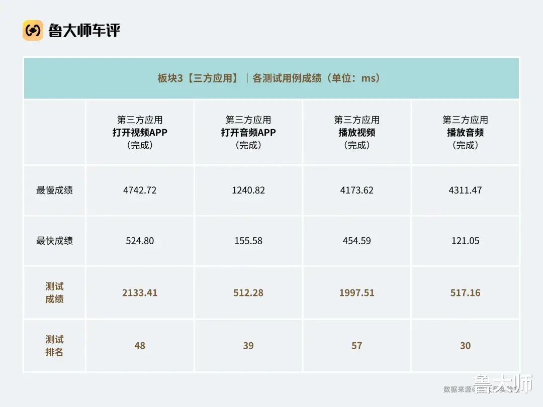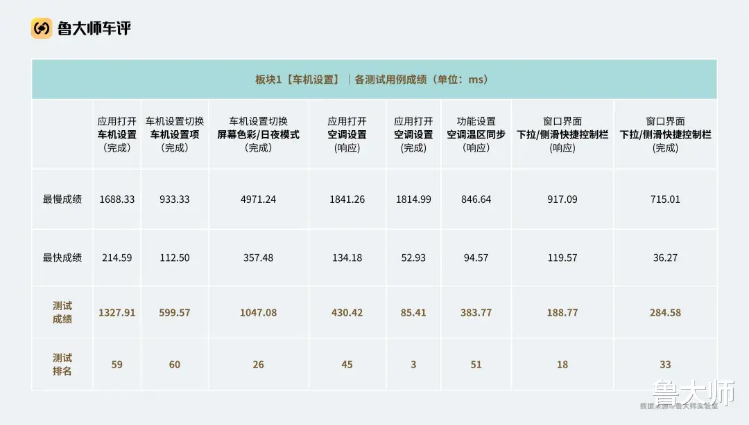 其中,辅助影像视角切换的完成时延仅为102.91ms,单项排名第4名;而在涉及后视镜相关功能调用的测试中,打开后视镜的完成时延为1596.26ms,单项排名第2,体现出在关键功能联动场景下较好的系统响应能力。语音部分同样有亮点。