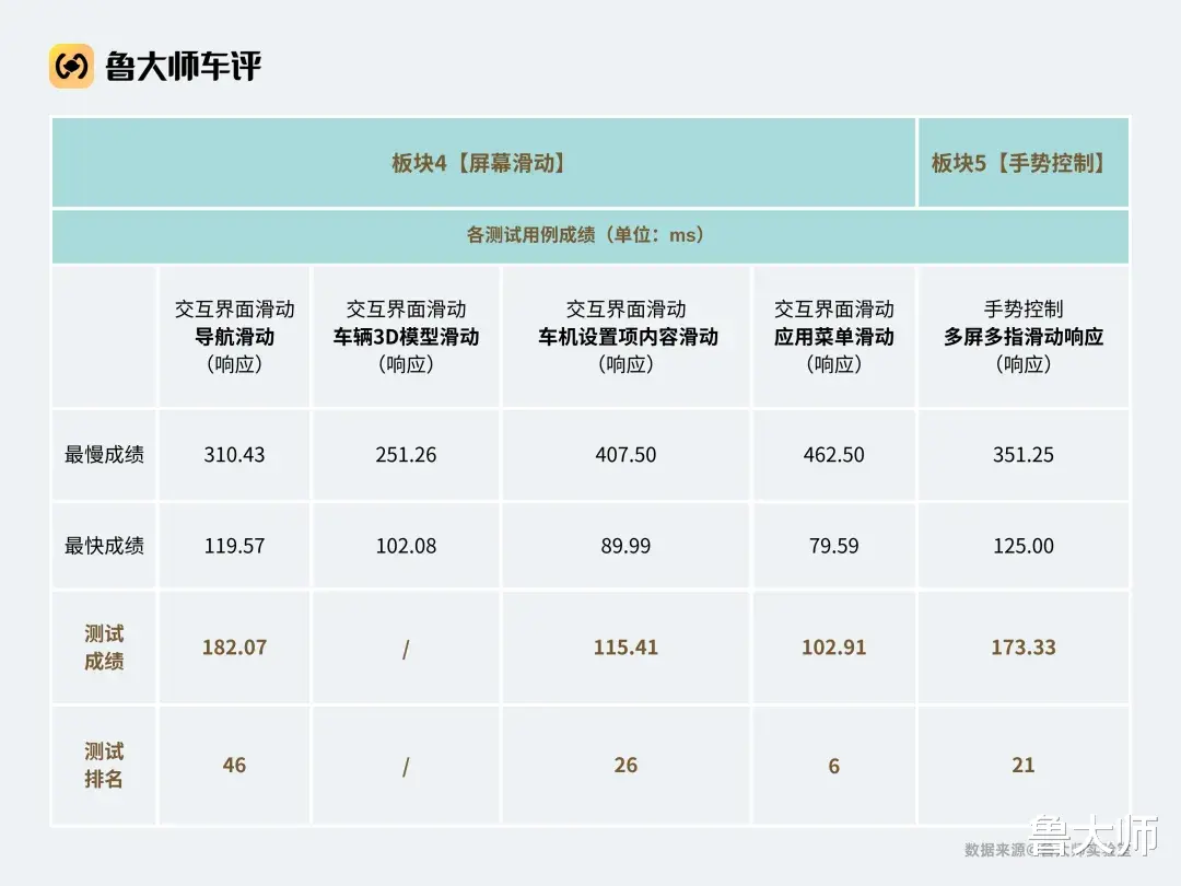 在【语音唤醒】板块中,语音多指令功能响应的完成时延为4235.02ms,单项排名第9,属于当前榜单里靠前的一档。结合其越野定位来看,这套语音系统在连续指令、复合操作场景下,并没有明显拖慢节奏。再看屏幕滑动与手势控制。