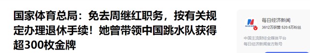 国家体育总局官网发布最新一期《干部调整信息》,宣布免去周继红的游泳运动管理中心主任、国家跳水队领队职务。