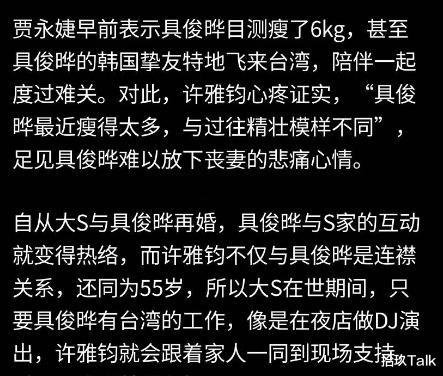 报道里说,大S的家人,小S、许雅钧,还有具俊晔,他们的反应各不相同。 小S伤心欲绝,许雅钧忙前忙后处理后事,具俊晔…网上说他默默流泪,但也有人说他只是在演戏。 这其中,是不是有什么更复杂的关系?