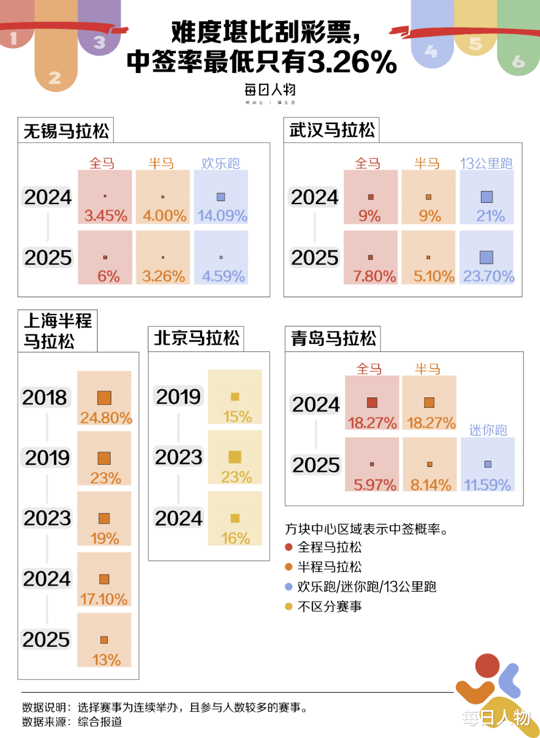 每日人物根据公开报道统计了这两年30场各类路跑赛事的中签率,在所有的马拉松大赛中,无锡马拉松中签率最低,今年无锡半程马拉松的中签率只有3.26%。在所统计赛事中,一半赛事的中签率低于10%。