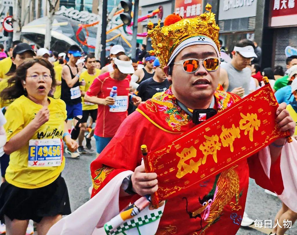 还有人要为马拉松再搭上一笔“妆造费”,致力于成为赛场上的“显眼包”。有人扮演成哪吒,头戴冲天假发,手拿火尖枪,颈绕乾坤圈,“凌晨五点就要起床画烟熏妆”——主打“稳定发癫”;还有人扮成财神,戴着帽子和假胡子跑完全程,就算浑身是汗,装束也得齐全。一套“显眼包”的服装下来,少说又是几百元的支出。