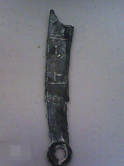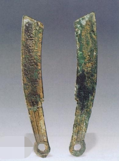 3、博山刀:齐明刀之壹种。燕昭王二十八年至齐襄王五年(前284-前279),燕国攻占齐大片领土时铸。清代嘉庆年间山东省博山香峪村出土,字样特殊,习称“博山刀”,传世极少。背面铸有三字或四字,壹般开头两字都是“莒冶”。1979年,山东莒县故城遗址曾出土有这种刀币的钱范。
