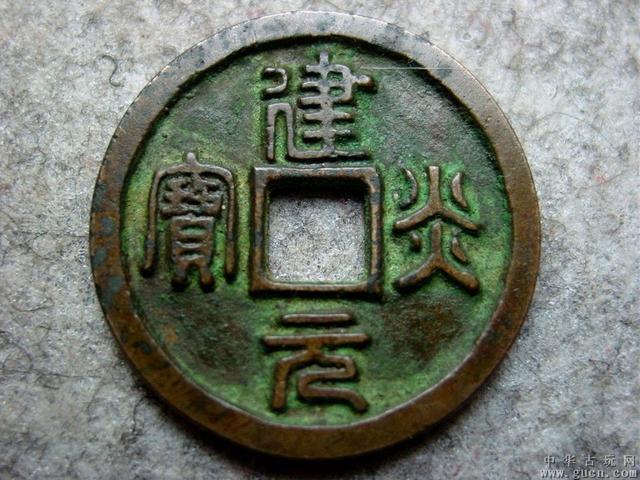 38、建国通宝:北宋宋徽宗趙佶有建中靖國年號,但建國通寶僅有篆書,楷書小平對錢各壹,其中篆書錢銅色金黃,狹穿大字,面帶黑斑及松花綠銹,據說出土於蘇北,曾被錢幣收藏大家羅伯昭先生以400銀元購得。也有人認為此錢太過離奇,懷疑是建炎通寶改刻而成,但據考證,建國通寶是取建中靖國年號的首尾二字組合而成鑄造的貨幣,卻因趙佶的建中靖國年號中的“建中”二字與唐代某年號重復,所以此幣剛剛鑄成就馬上廢止,而改鑄非年號的“聖宋通寶”、“聖宋元寶”。因此建國通寶極為珍稀,存世量不超過10枚,無法估價,稱建國通寶為北宋第壹珍稀幣並不為過。楷書建國通寶早在清末,民國時期曾被發現,可惜皆已流失,1956年錦州博物館在發掘清代範子和墓時,曾經出土壹枚隸書“建中靖國”錢,銅質厭白,屬於夾錫錢壹類,實屬僅見。請大家欣賞國家博物館所藏名珍篆書體建國通寶。根據實物考證篆書體建國通寶的版別有三種,均屬試鑄。