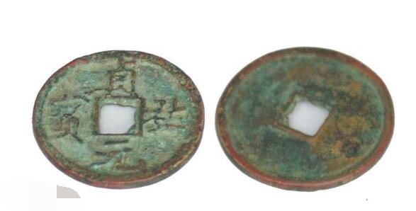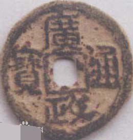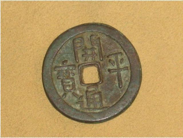 15、開平通寶、元寶:梁錢。開平是五代梁朱溫年號(907-911),存世僅通寶、元寶大銅錢各壹枚,對其真偽錢幣界看法不同。另有開平元寶鉛質小錢,系南漢劉隱奉梁正朔而鑄。