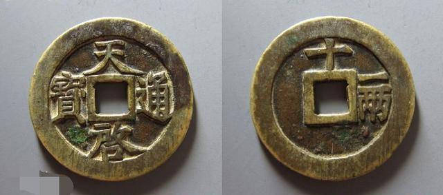 45、天国通宝:天國背通寶當十是太平天國建都南京後第壹批試鑄的通用錢幣,因不久即改鑄太平天國聖寶錢而屬臨時過渡性的錢幣,因此鑄額有限而十分罕見.