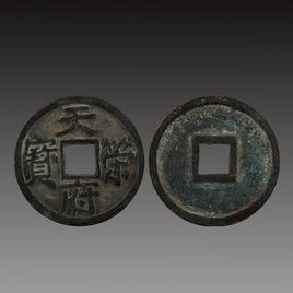 18、天德重寶:閩錢。天德年間鑄,有銅、鐵兩種,當百使用,背穿上“殷”字,以紀國號。