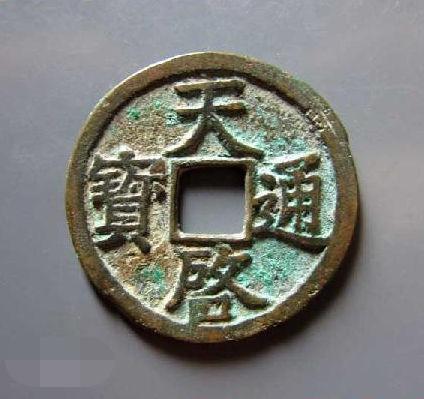 43、天启通宝:元天啟通寶比較珍稀,尤其是篆書折三天啟錢為壹級品,為可遇而不可求之神品;而明天啟錢則版式較多,有小平錢、折二錢、折三錢、折五錢、折十錢多種,質地也為黃銅,但錢文卻均為楷書。元天啟錢光背,而明天啟錢背豐富多彩,背字有:日、月、工、戶、浙、京、新等多種,紀值有二、十、十壹兩等,當然還是以光背為常見。