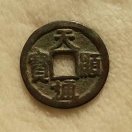 33、天显通宝:天顯通寶隸書小平光背無定價遼太宗天顯年間鑄,據內蒙出土:徑2.38厘米,重2.7克。文字自然,頗具遼錢風韻,隸書體旋讀,傳世甚罕。太宗天顯年間(947-950年)鑄,僅發現1枚孤品,該錢已流入日本。