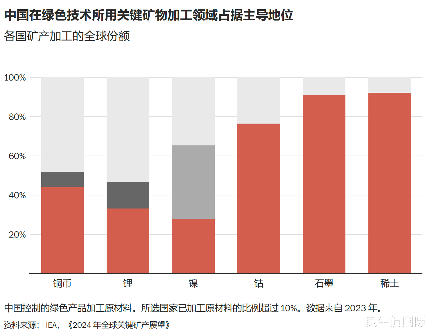 如今,中国已成为全球“盟主”:去年,中国提炼了全球四分之三的钴和91%的石墨,还生产了全球92%的已加工稀土元素。这使得中国制造商能够以低廉的价格轻松获得关键零部件。