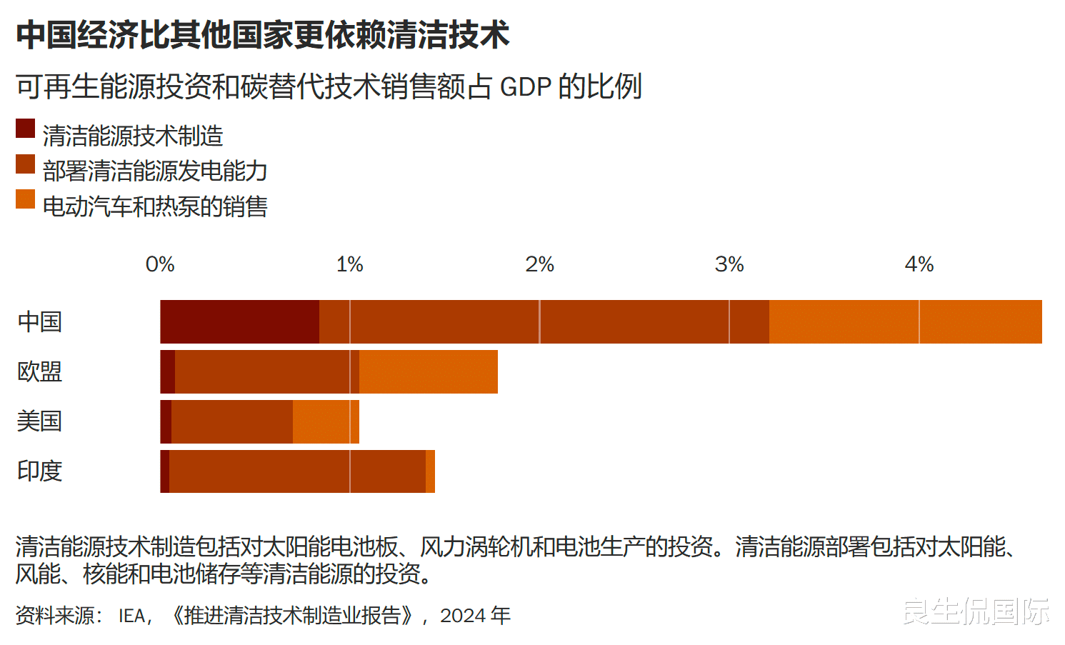 国际能源署(IEA)的分析亦显示,2023年,“绿色科技”对中国经济的贡献明显高于欧盟、美国或印度。国际能源署(IEA)数据显示,2024年,中国在清洁技术制造领域的投资接近6800亿美元,“几乎与美国和欧盟的总和一样多”。