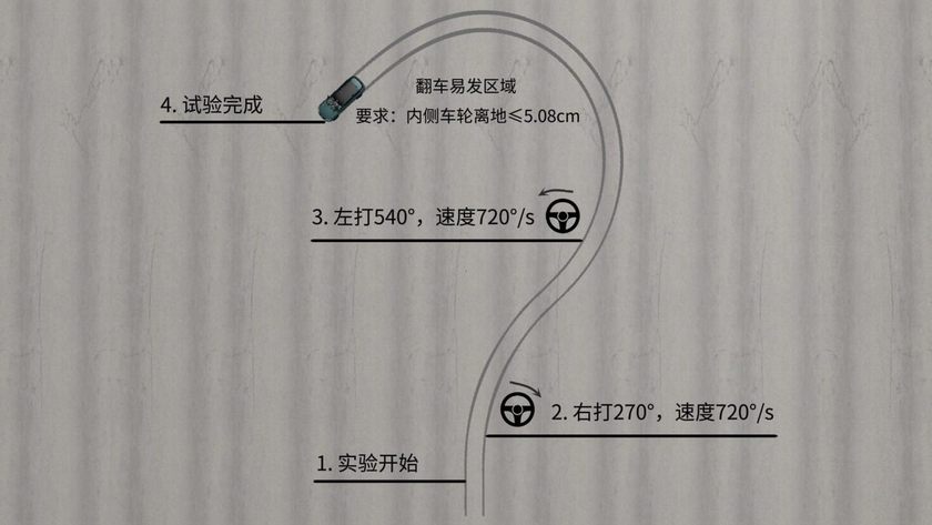 鱼钩测试国际标准:鱼钩测试是检验车辆抗侧翻能力的试验,模拟的是高速避障急转向的驾驶情况。测试要求车辆以56km/h-80km/h的规定速度进入试验区域,迅速向车辆一侧急转270°,2s内当车辆达到最大侧倾角时,再迅速反向将方向盘急转540°。测试要求转向速度为720°/s,这种极限的手速和操控精准度对有经验的驾驶员来说都难以完成,因此该测试由转向机器人操控,以保证测试的客观性。