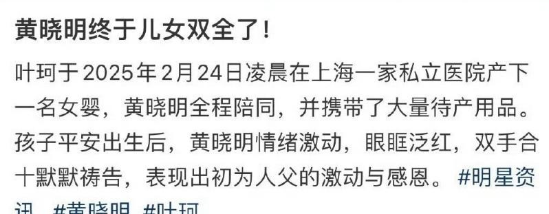 最近啊,娱乐圈真是热闹非凡,这边厢陈晓陈妍希离婚的消息还没消化完,那边鹿晗关晓彤分手的传闻又炸开了锅,真是让人应接不暇!这不,新的“大戏”又开场了——黄晓明叶珂疑似生女,这消息一出,直接冲上热搜榜首,热度蹭蹭往上涨!