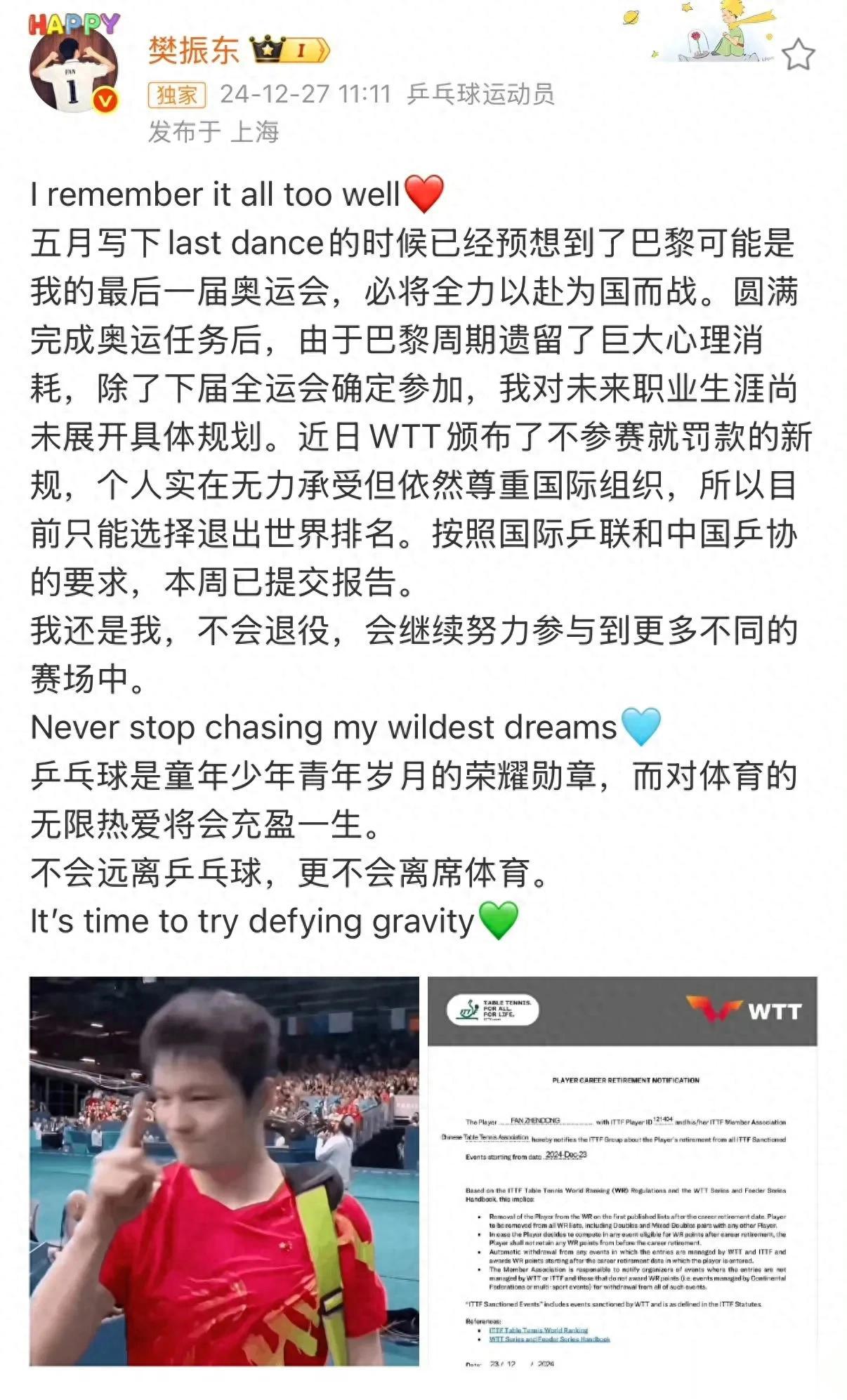 还记得2024年12月27日,樊振东宣布退出世界排名。