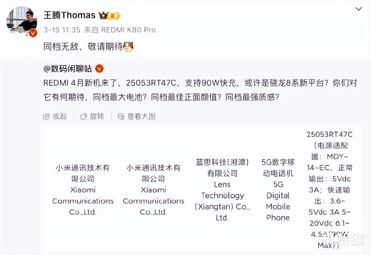 王腾的设备型号已经从一直在用的“REDMI K80 Pro”,换成了“小米手机”,这显然是一部还未正式发布,机型暂时不能公开的测试机。