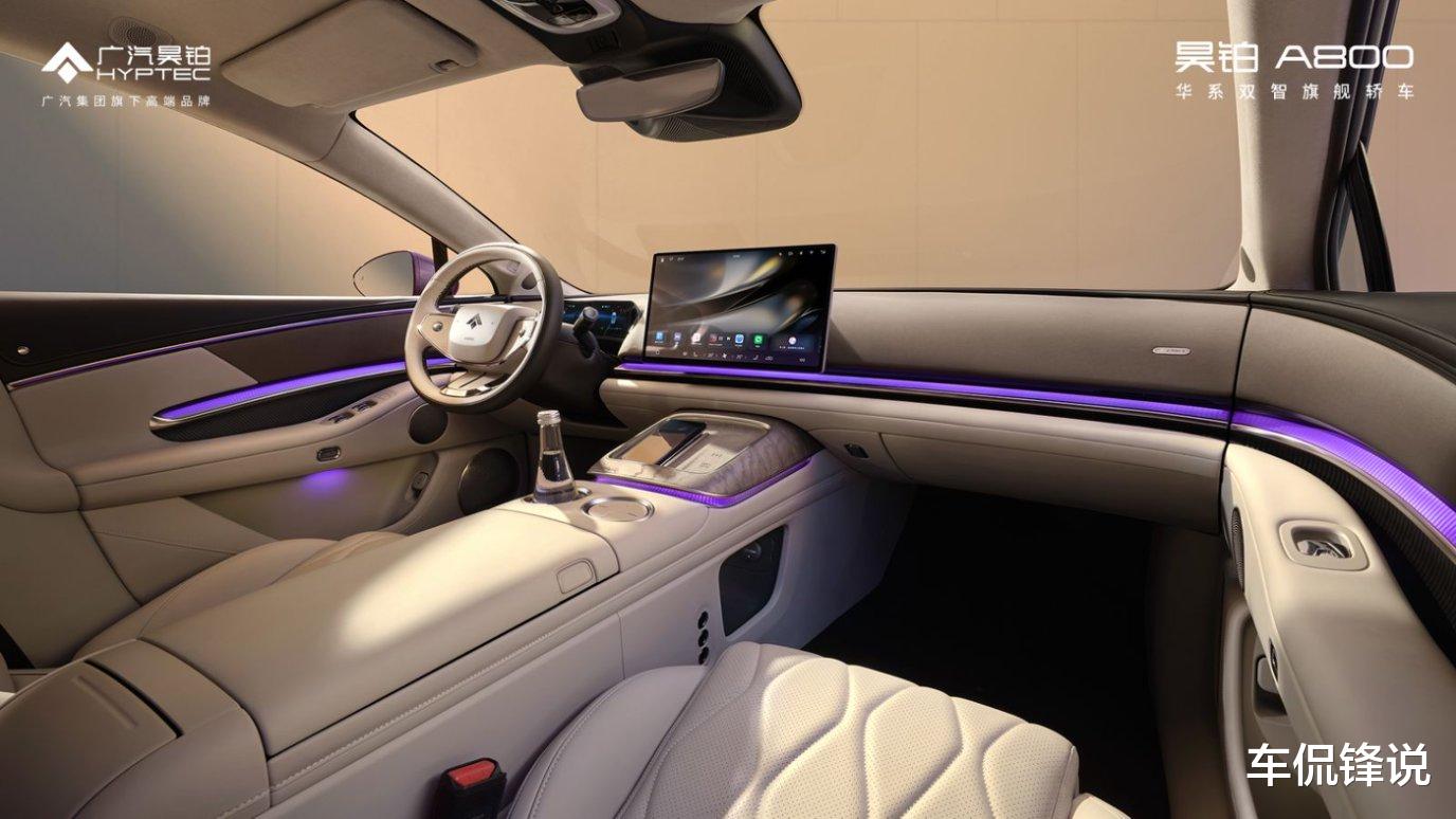 整个内饰设计上,广汽昊铂A800采用 “星际座舱” 理念,中控台呈环抱式布局,拥有10.25英寸全液晶仪表、14.6英寸中控屏以及27英寸W-HUD,内饰的观感显得很清爽、科技。本身这款车就是与华为深度合作的,其内置的是HarmonySpace 5 鸿蒙系统,支持多设备协同与OTA升级,语音控制支持 5 米内免唤醒交互,可精准执行连续指令等。至于一些更具体配置,则还要等披露。