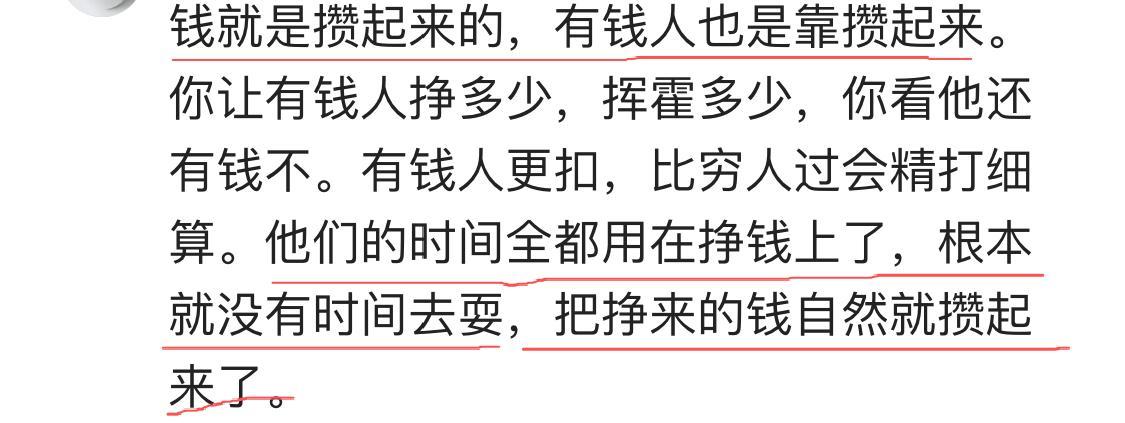 钱就是攒起来的,有钱人也是靠攒起来。你让有钱人挣多少,挥霍多少,你看他还有钱不。有钱人更扣,比穷人过会精打细算。他们的时间全都用在挣钱上了,根本就没有时间去耍,把挣来的钱自然就攒起来了。