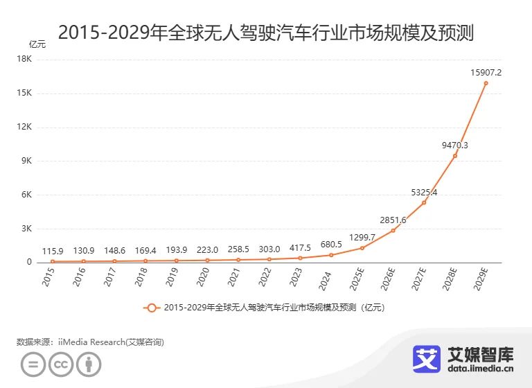 iiMedia Research(艾媒咨询)数据显示,2024年全球无人驾驶汽车市场规模达到680.5亿元,行业呈现快速增长的态势,预计2029年全球无人驾驶汽车市场规模达15907.2亿元。