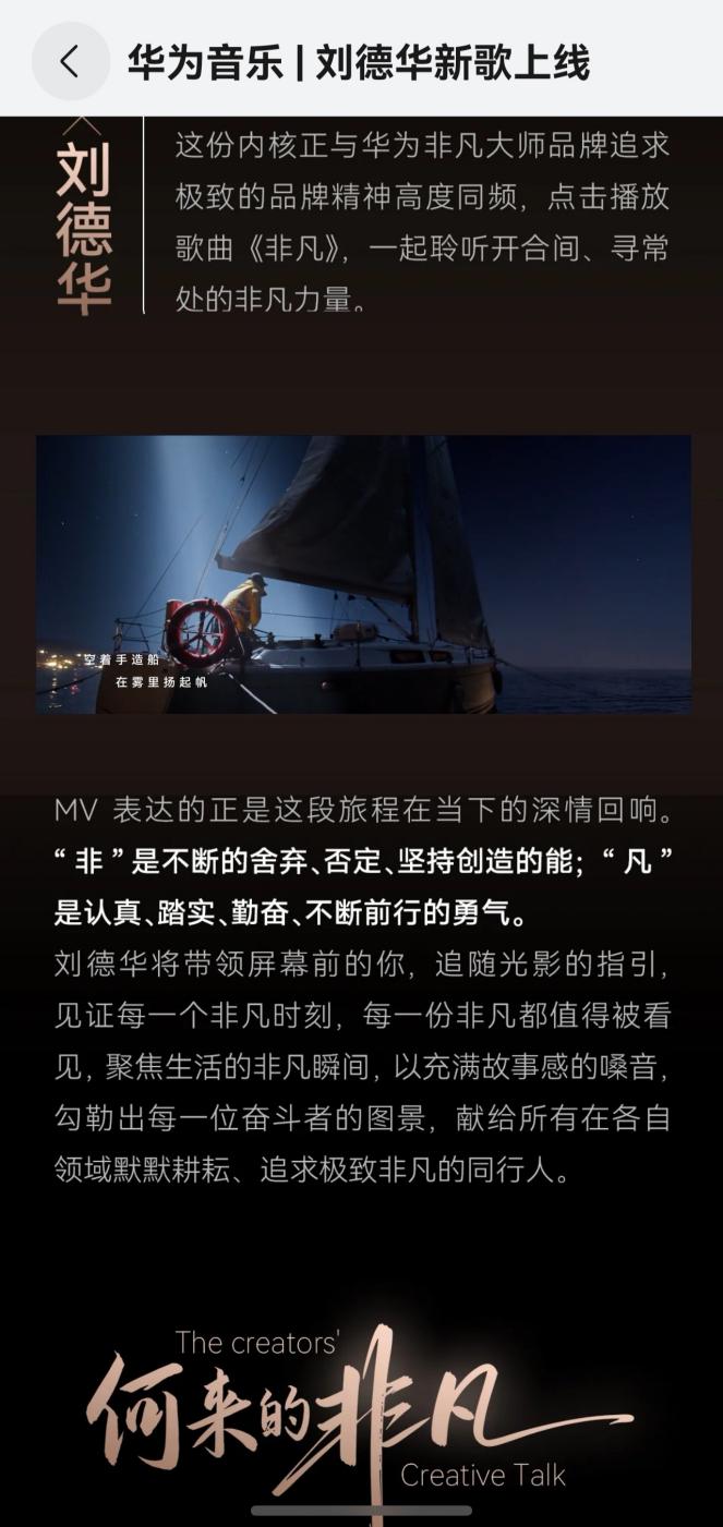 就在12月29日,刘德华携手华为非凡大师打造的品牌主题曲《非凡》以及MV正式上线华为音乐,还是那个熟悉的声音,却多了一份岁月沉淀后的从容与厚重。