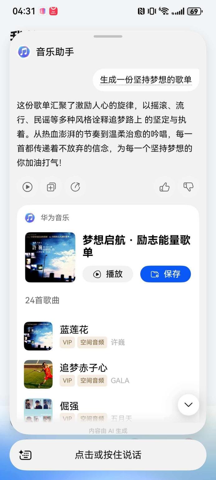 听到动情处,那份关于“踏过山外山”的鼓舞让人心潮澎湃,特别需要一些同样激励人心的歌。于是我顺手点开升级HarmonyOS 6后的华为音乐,进入“我的”页面点那个彩色按钮,唤醒了“音乐助手”,直接对它说“生成一份坚持梦想的歌单”,它会立刻生成了一份量身定制的励志歌单,就像身边坐着一位懂音乐的老友。