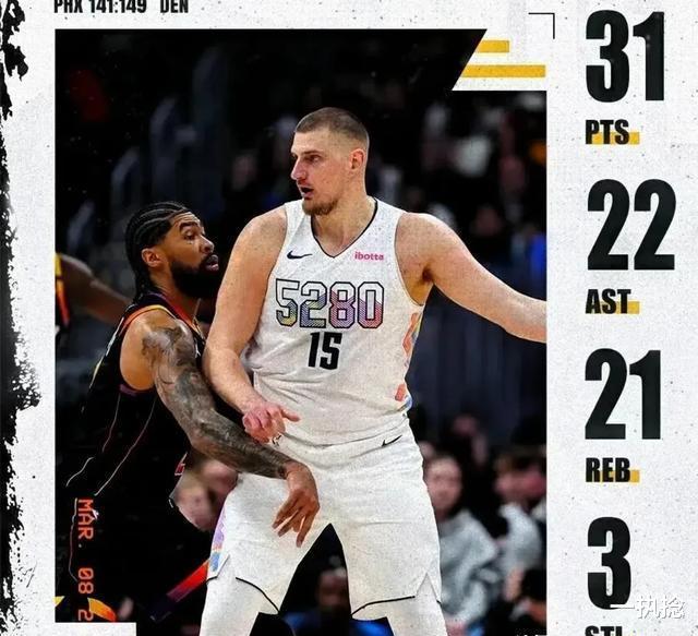 聊完东契奇,咱们看看掘金当家球星约基奇今年的状态。这位全能中锋完全突破了人们对传统内线的认知,就拿最近对战太阳那场来说,直接炸出30分+20板+20助的史诗级三双,这种夸张的统治力放在整个NBA历史长河里都罕见。即便把巅峰期的邓肯、奥尼尔这些名人堂级别的超级中锋拿出来作比较,面对约基奇这种全面到离谱的比赛数据也得甘拜下风。