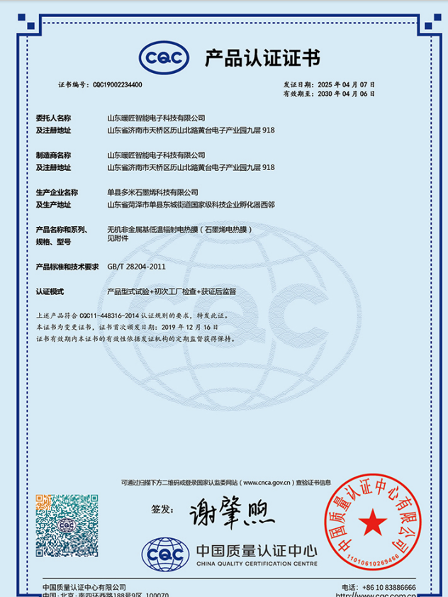 产品质量是企业的生命线。公司通过GB/T9001质量体系认证、ISO14001:2004环境管理体系认证及OHSAS18001职业健康安全管理体系认证,建立了严格的质量管控流程。公司生产的石墨烯电热膜通过了中国质量认证中心CQC认证、SGS的ROHS认证、俄罗斯EAC认证和欧洲CE认证,产品质量达到国际先进水平。