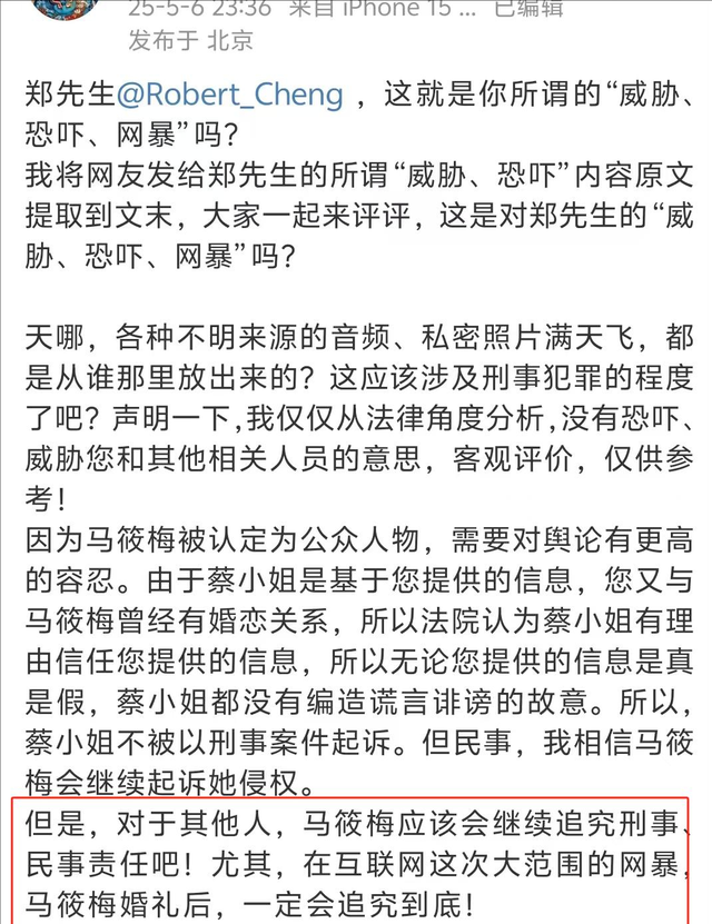 律师还强调,将会继续追究网络暴力的责任,确保马筱梅的名誉和婚姻不受任何非法攻击。
