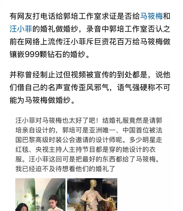 最初,有传闻称,汪家曾打算让知名设计师郭培为马筱梅量身定制婚纱。