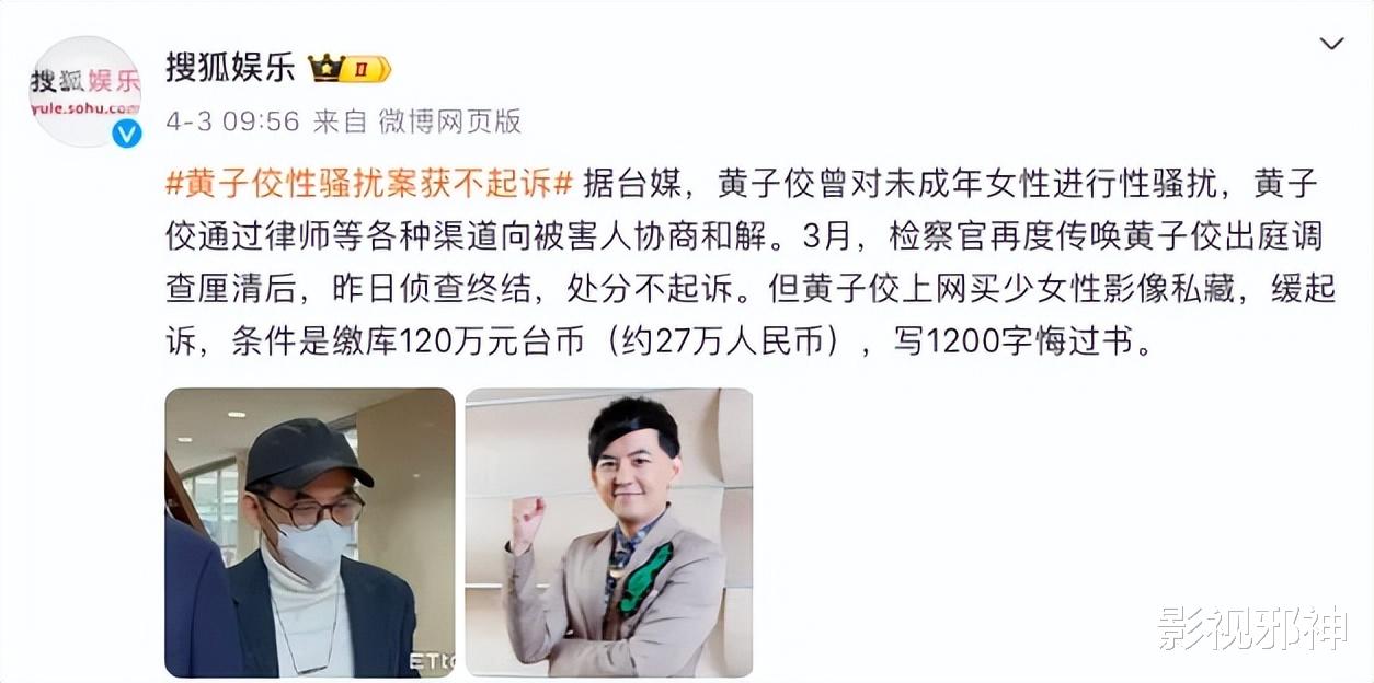 台媒报道称因他通过各种渠道向被他性骚扰的受害人协商和解,所以没有被检警起诉。