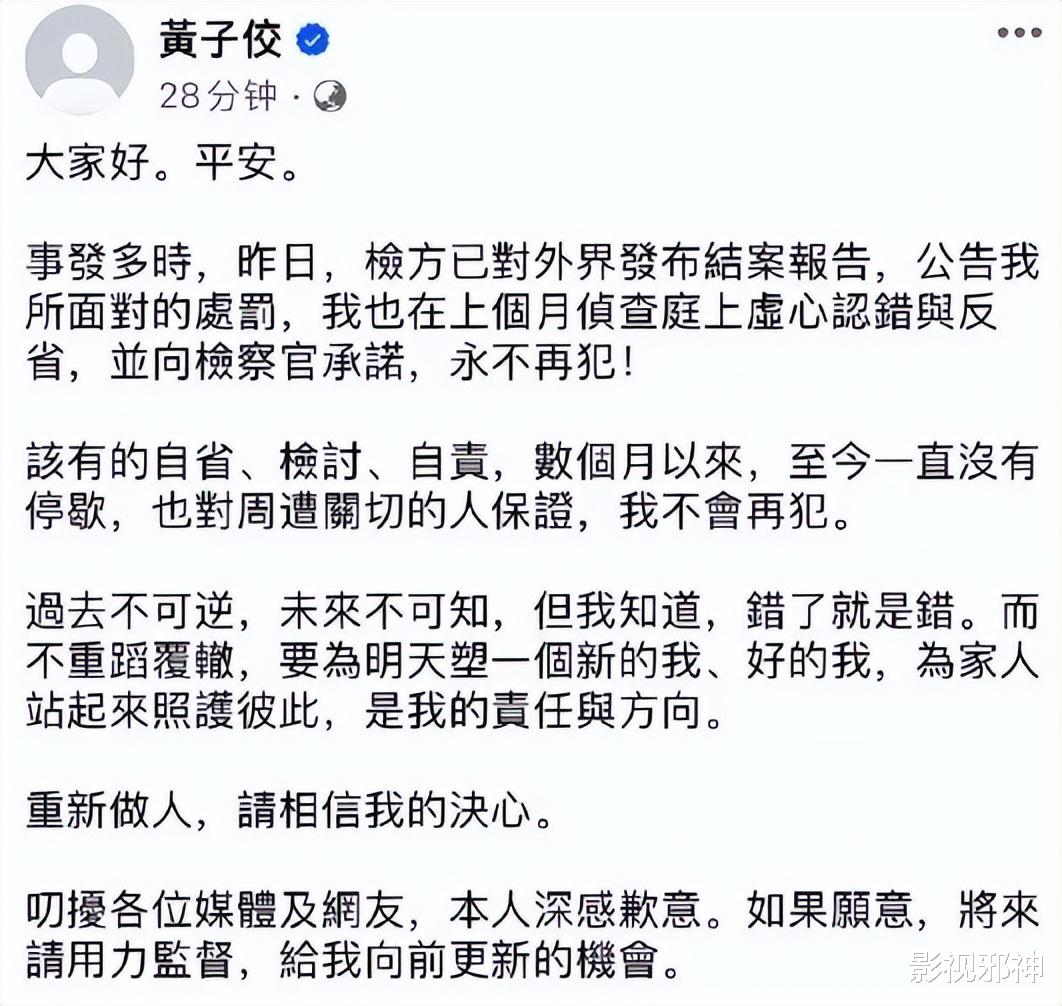黄子佼发了一篇轻飘飘的道歉声明,不痛不痒道了歉,保证自己永不再犯,将重新做人,还试图打好男人牌,说将来要为家人站起来照护彼此。