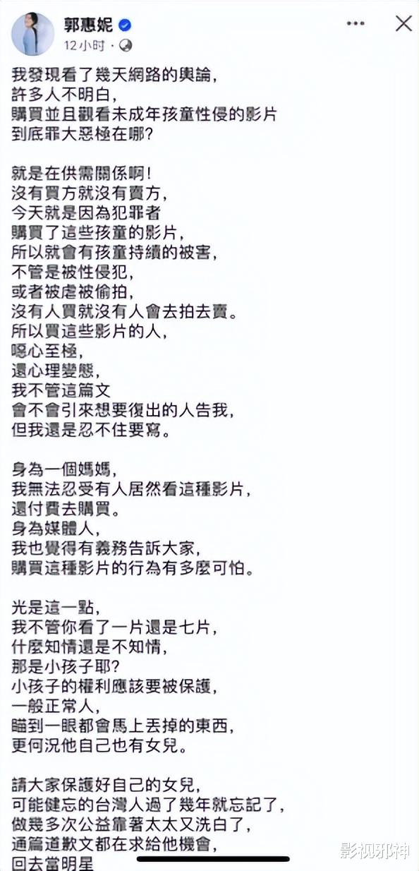 女主持郭惠妮痛骂买视频的黄子佼恶心至极:“没有买方就没有卖方,因为犯罪者购买了这些孩童的视频,所以就会有孩童持续的被害,不管是被性侵犯,或者被虐被偷拍,没有人买就没有人会去拍去卖。”