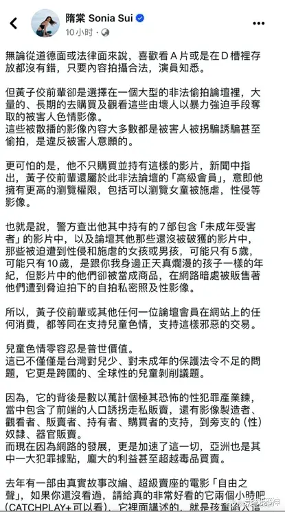隋棠更是表态说未来将不再以任何形式参与和黄子佼相关的演艺工作,以提醒自己不任意成为剥削儿童的帮凶。