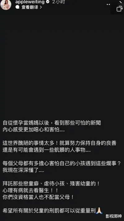 胡小祯也发文谴责黄子佼,说他必须受到法律的制裁:“我真作呕,有人居然对未成年如此着迷?”