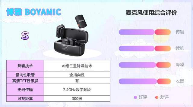 综合实力评价:适配市面上主流手机、相机设备,即插即用,专业与易用X兼顾。搭配充电盒综合续航50小时,可满足连续两天录制。8G板载内存支持15小时内录,断连也不会丢失素材,但录满会自动覆盖,需及时备份。
