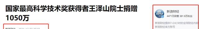 3.新浪财经:《国家最高科学技术奖获得者王泽山院士捐赠1050万》-2021-12-2